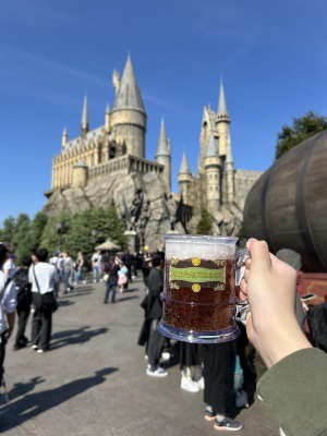 見学旅行3日目。私たちは大阪、USJ(ユニバーサル・スタジオ・ジャパン)に向かいました。門を潜った先には、なんとも豪華な世界が!様々なアトラクション、飲み物や軽食、果ては巨大なお土産屋など、非日常の連続!中でも私のグループは、「ウィザーディング・ワールド・オブ・ハリー・ポッター」というハリー・ポッターをテーマにしたエリアをメインで楽しみました。劇中に登場する飲み物である「バタービール」を再現しているドリンクは、バタースコッチのような風味で、甘い炭酸にクリーム状の泡が乗っており、ジョッキも本物のように大きく、それだけでお土産になります!実際私も家で使っています。